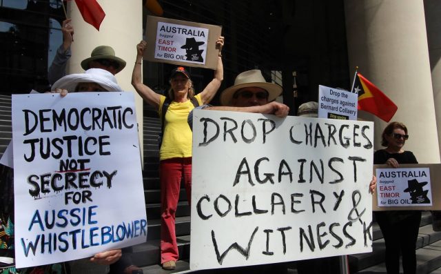 “Ba hau nia kolega hotu iha Movimentu Kontra Okupasaun Tasi Timor. Diak ka lae? Hau nia naran Bernard Collaery, hau hosi Canberra, Australia. Hau urgullu katak hau ajuda povo Timor-Leste luta ba justisa. Hau sei kontinua ajuda imi luta ba justisa maski sira halo prosekusaun ba hau no Witness K sei kontinua hela. Obrigado barak, Viva Timor, Bernard”.