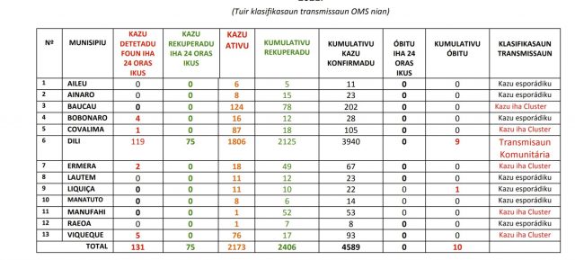 Kazu rekuperadu hamutuk 75, total kazu ativu 2173. Husi horiseik mai ohin ema hamutuk 553 mak halo teste PCR iha Dili. Kumulativu kazu konfirmadu iha Dili hosi tinan 2020 to’o ohin loron total 1806 no total kazu obitu ka ema mate ho COVID to’o ohin loron hamutuk 10.
