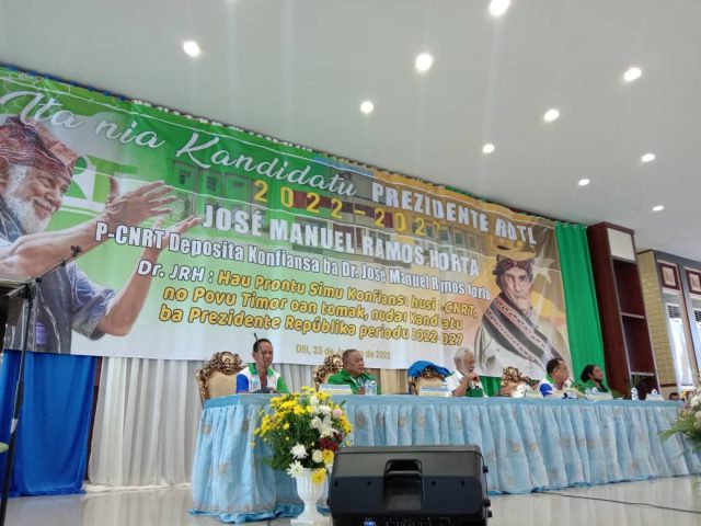 “Ha’u prontu simu konfiansa husi P-CNRT, no povu Timor oan tomak, nudar kandidatu ba Prezidente Repúblika periodu 2022-2027.” Deklara Jose Ramos Horta, iha salaun Mahoka, 23/01/2022.